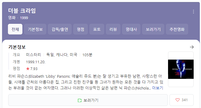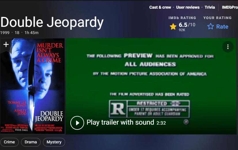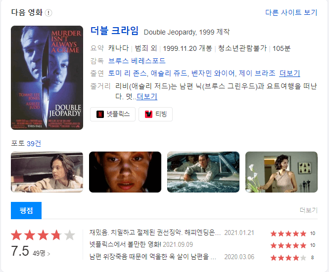 오늘 포스팅은 1999년에 만들어진 더블 크라임에 대해서 알아보겠습니다. 20년도 더 된 오래된 영화이지만, 잘 짜인 각본에 특히나 애슐리 주드의 전성기 꽃미모를 감상할 수 있습니다. 요즘 넷플릭스 순위 8위에 올라와 있네요.