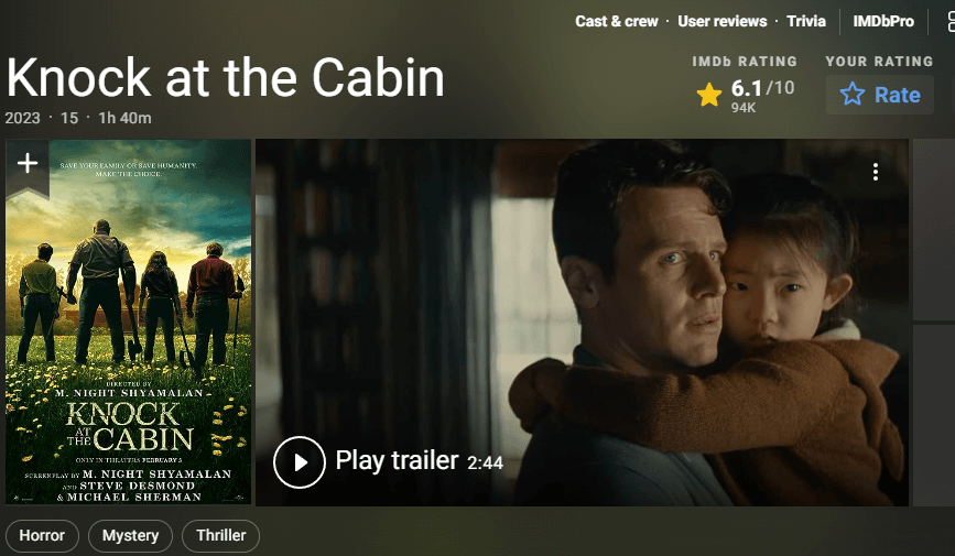 호러와 공포영화에 강점을 보였던 샤말란 감독의 최신작으로 영화 똑똑똑은 아바타도 제치며 북미 박스오피스 1위도 차지했습니다.