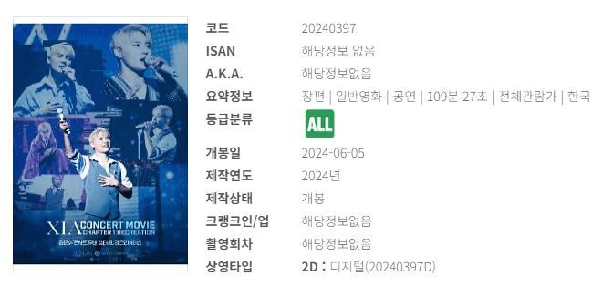 | 10 | 김준수 콘서트 무비 챕터 원 : 레크리에이션 | 3,122 | 71,806,000 | 0.8 | 2024-06-05 |