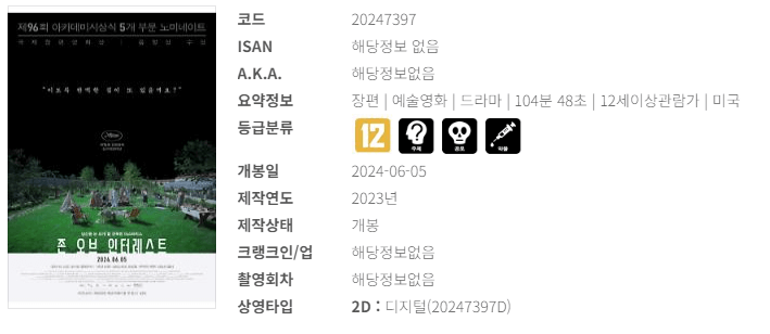 | 7 | 존 오브 인터레스트 | 6,025 | 62,034,155 | 1.1 | 2024-06-05 |