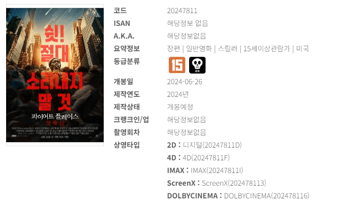 | 5 | 콰이어트 플레이스: 첫째 날 | 21,248 | 199,348,217 | 3.9 | 2024-06-26 |