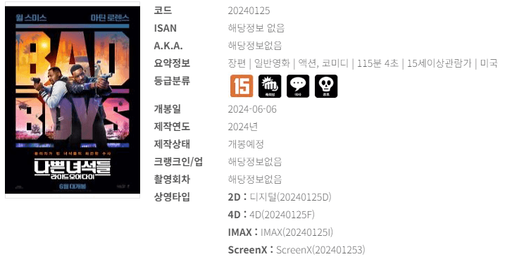 | 6 | 나쁜 녀석들: 라이드 오어 다이 | 9,437 | 103,445,056 | 4.8 | 2024-06-06 |