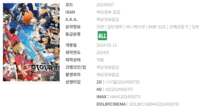 | 3 | 극장판 하이큐!! 쓰레기장의 결전 | 18,263 | 202,290,635 | 9.2 | 2024-06-05 |