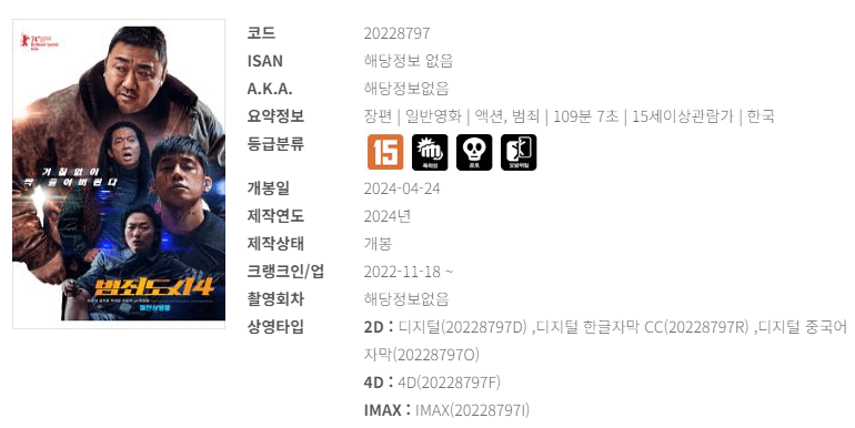 | 10 | 범죄도시4 | 5,191 | 46,289,078 | 2.6 | 2024-04-24 |
