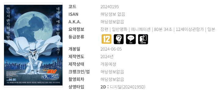 | 5 | 명탐정 코난 VS 괴도 키드 | 11,300 | 112,301,300 | 5.7 | 2024-06-05 |