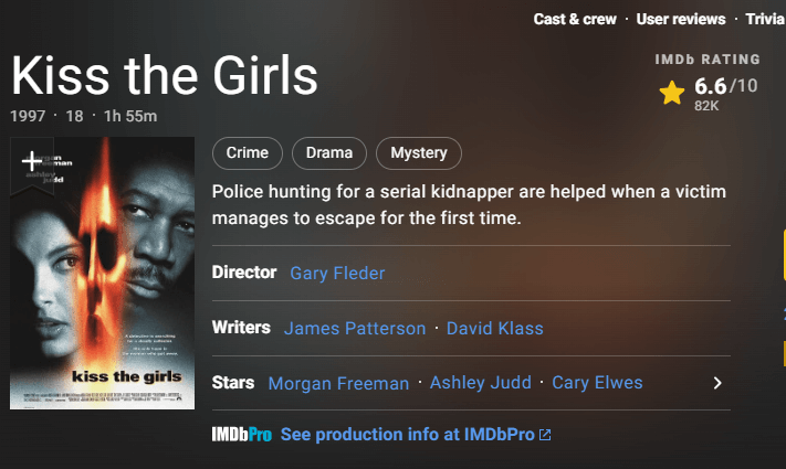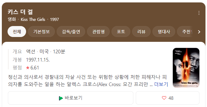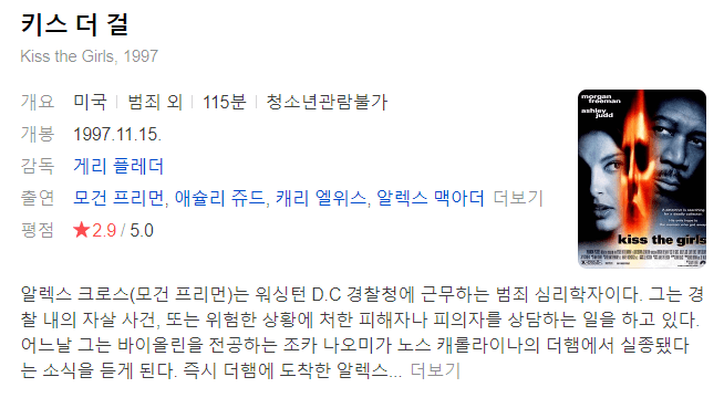 그럼, 오늘은 키스 더 걸(Kiss The Girls) 줄거리, 평점, 후기에 대해서 알아보겠습니다.
