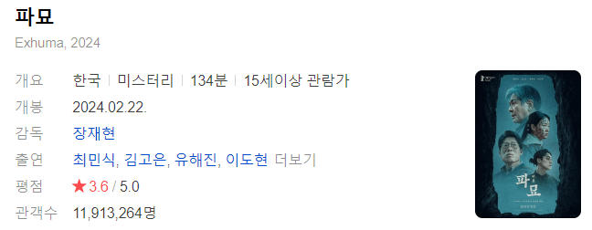 파묘 다음 영화 평점 : 3.6 / 5.0