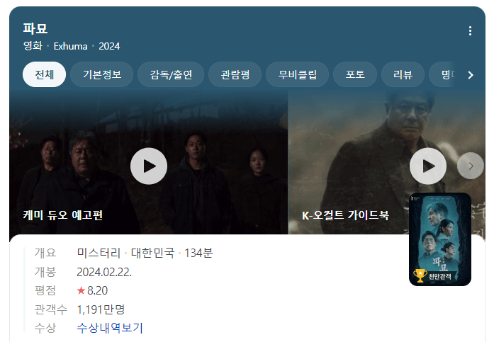 파묘 네이버 영화 평점 : 8.2 / 10.0